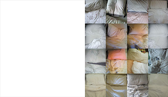 | Notes: | Various souls, from between the sheets of 100 beds, poised before the same exit. The photographs of beds were taken according to instruction and mostly emailed to the author, coming courtesy of friends, colleagues and neighbours. |